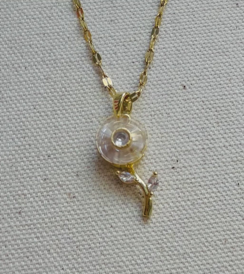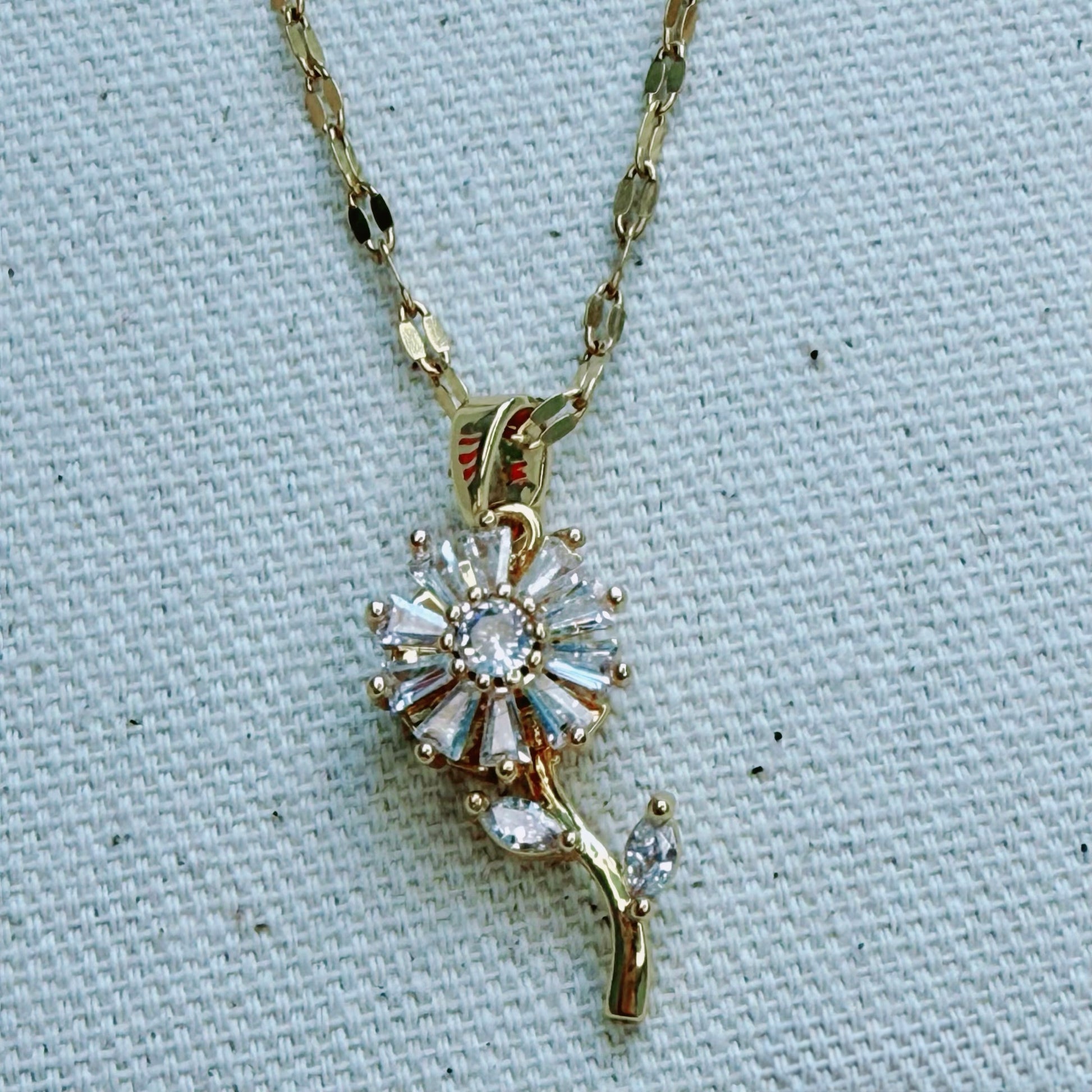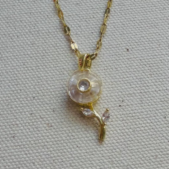 Der filigrane Blütenanhänger aus vergoldetem Edelstahl lässt sich drehen und bringt so Bewegung und Leichtigkeit in deinen Look.