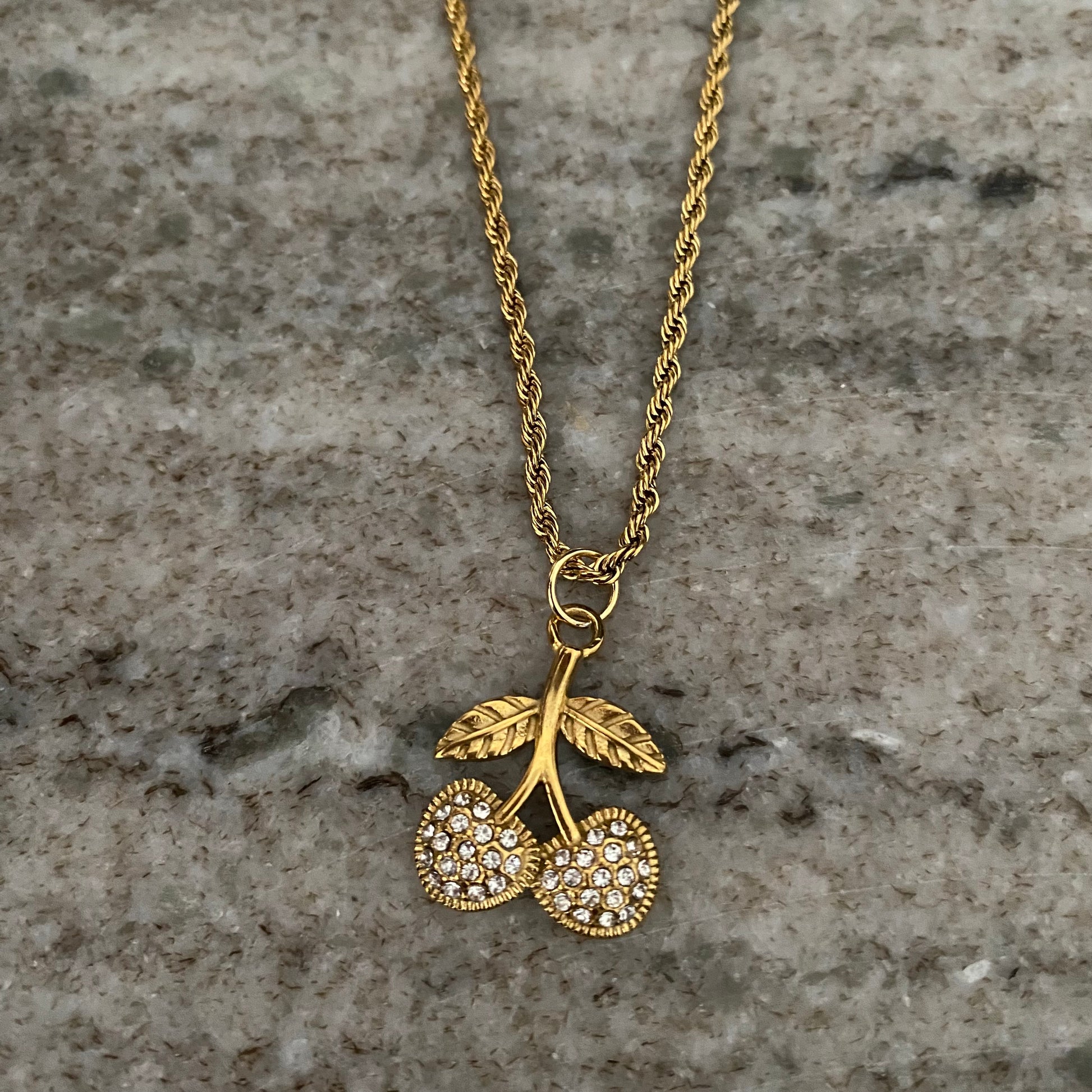 Verleihen Sie Ihrem Look einen verspielten und zugleich eleganten Touch mit diesem bezaubernden Schmuckset im Kirschdesign. Das Set besteht aus einer filigranen Goldkette und passenden Creolen-Ohrringen, jeweils verziert mit detaillierten Kirschanhängern 🍒. Die Kirschmotive sind mit funkelnden, klaren Zirkoniasteinen besetzt und sorgen für ein edles Funkeln bei jeder Bewegung. Die vergoldete Oberfläche verleiht dem Set eine warme, luxuriöse Ausstrahlung, während die feine Blattstruktur den Anhängern eine besondere Tiefe und Raffinesse verleiht.