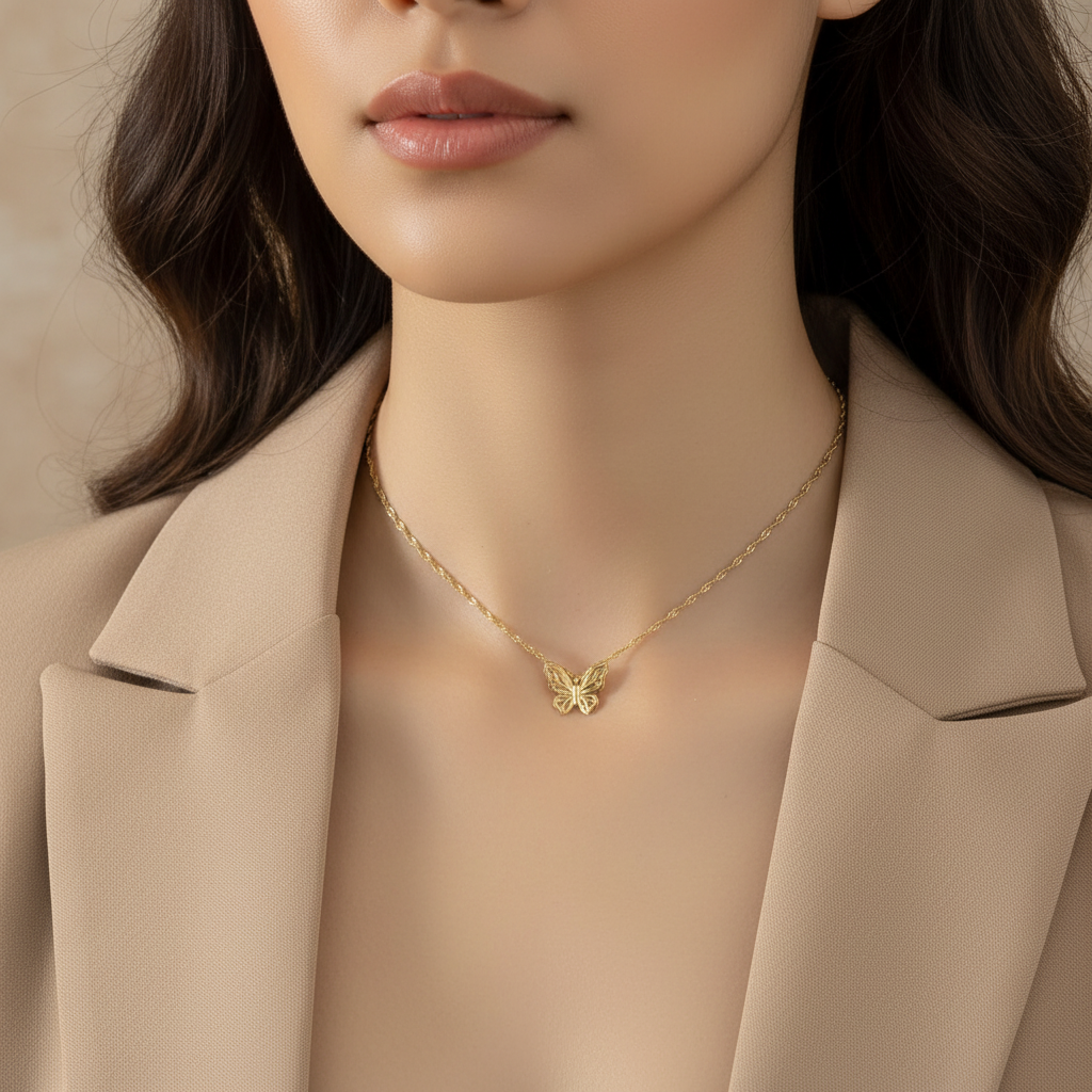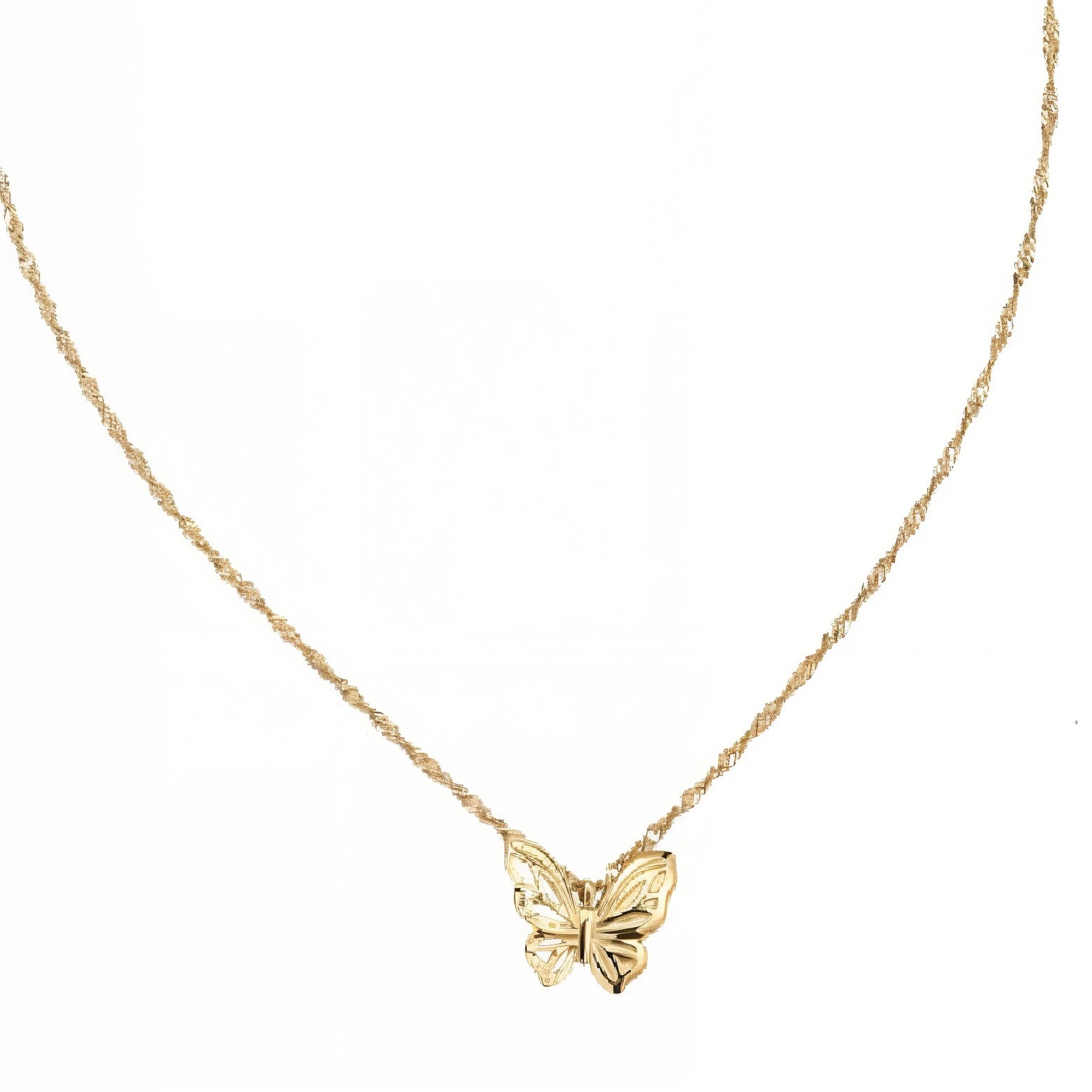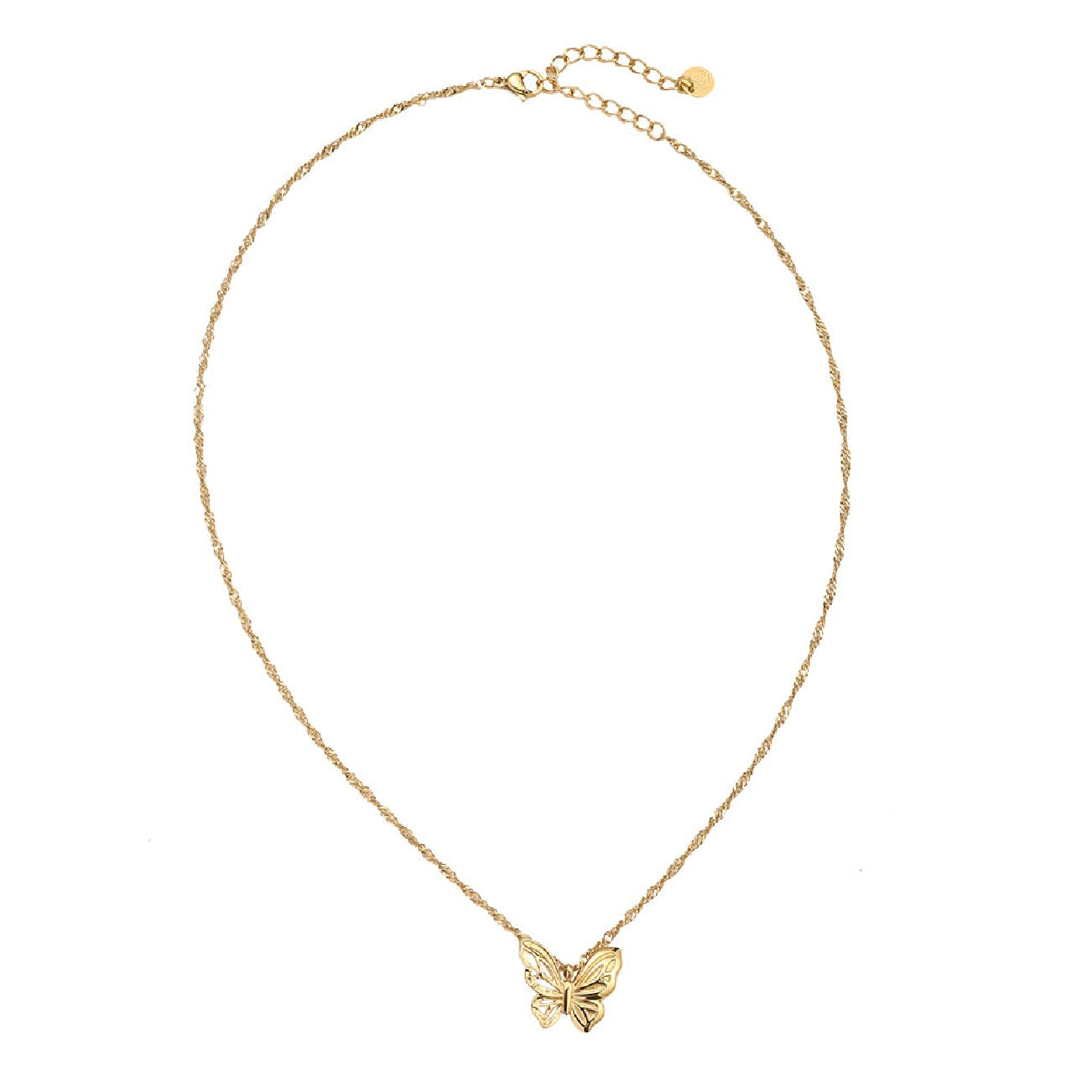 Bringe Leichtigkeit und Eleganz in dein Outfit mit unserer goldenen Schmetterling-Halskette. Der filigrane Schmetterlingsanhänger auf einer zarten Goldkette symbolisiert Freiheit, Transformation und Schönheit. Dieses feine Schmuckstück verleiht jedem Look einen verspielten, femininen Touch und ist ideal als stilvolles Accessoire für den Alltag oder als besonderes Geschenk für einen lieben Menschen.