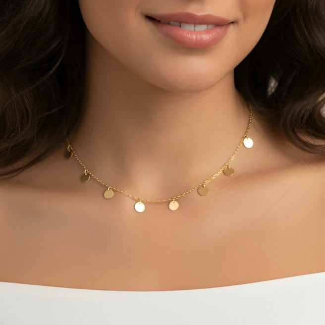 Diese elegante Halskette aus hochwertigem Edelstahl vereint zeitlose Eleganz mit modernem Design. Feine, goldene Plättchen zieren die filigrane Kette und schimmern bei jeder Bewegung dezent im Licht. Die Kombination aus glänzendem Metall und minimalistischen Plättchen macht die Kette zum perfekten Accessoire für jeden Anlass.