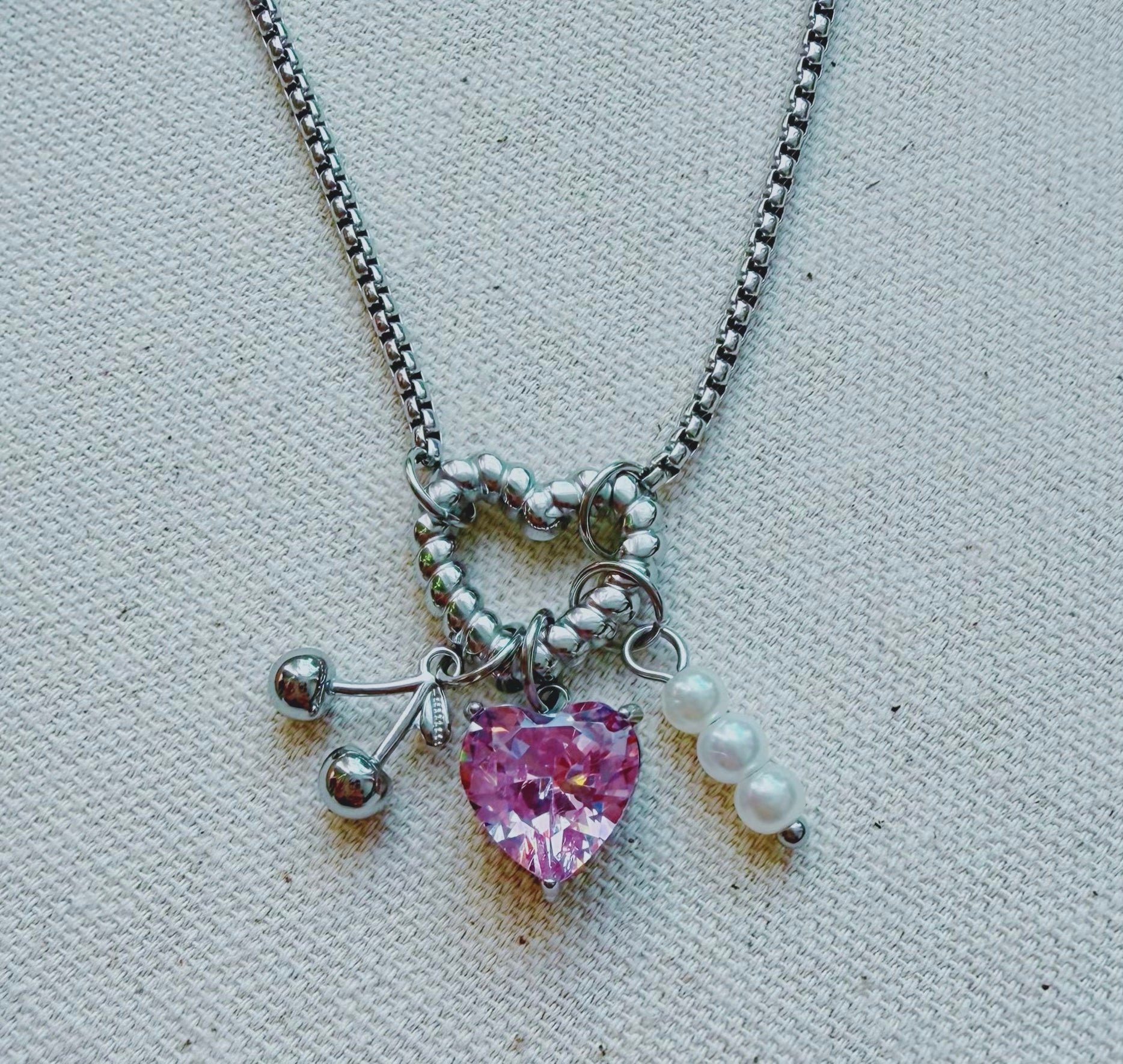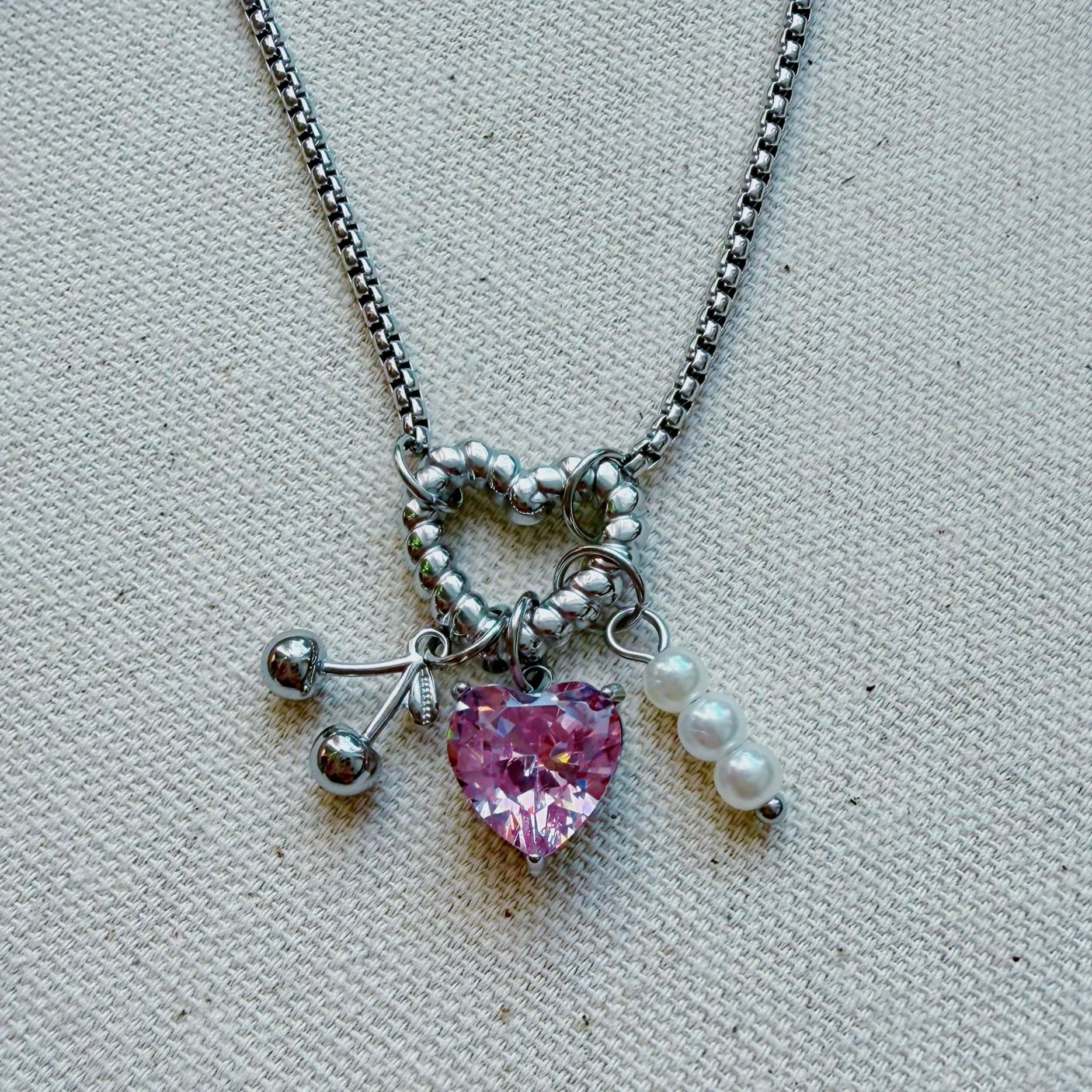 Im Mittelpunkt steht ein funkelndes rosa Herz aus Zirkonia-Steinen, das Liebe und Romantik symbolisiert. Zarte Süßwasserperlen und glänzende Mini-Perlen verleihen dem Design einen Hauch von Natürlichkeit und Anmut, während das kleine Kirsch-Element die Kette auf charmante Weise abrundet – ein süßer Eyecatcher mit sommerlicher Leichtigkeit.