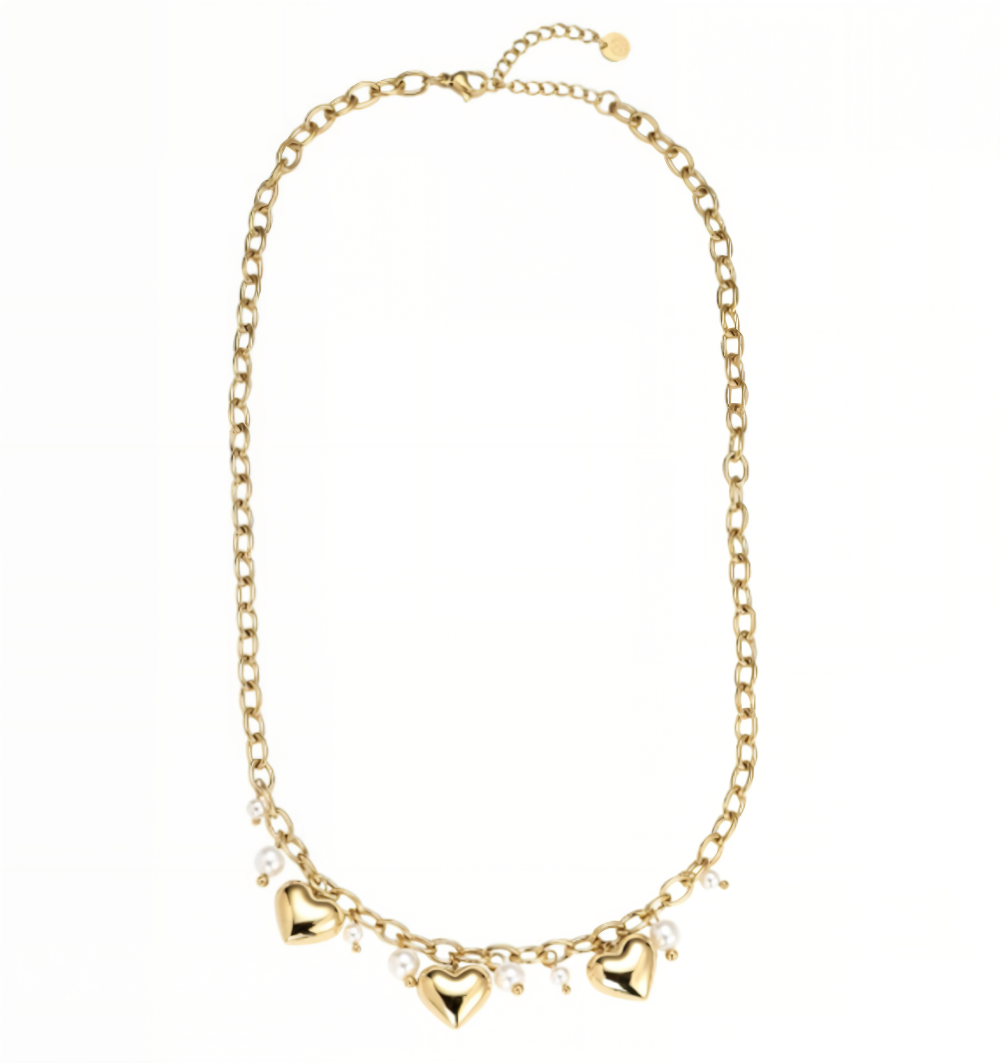 Dieses robuste Halskette kombiniert goldene Herzchen mit weißen Kunstperlen zu einem ausdrucksstarken und dennoch harmonischen Schmuckstück. Die stabil gearbeiteten Elemente verleihen dem Halskette eine spürbare Qualität und Langlebigkeit, während die glänzenden Perlen für einen edlen Kontrast sorgen. Die goldenen Herzen symbolisieren Stärke, Liebe und Beständigkeit – eine Halskette, das Präsenz zeigt und sowohl im Alltag als auch zu besonderen Anlässen ein echter Blickfang ist.