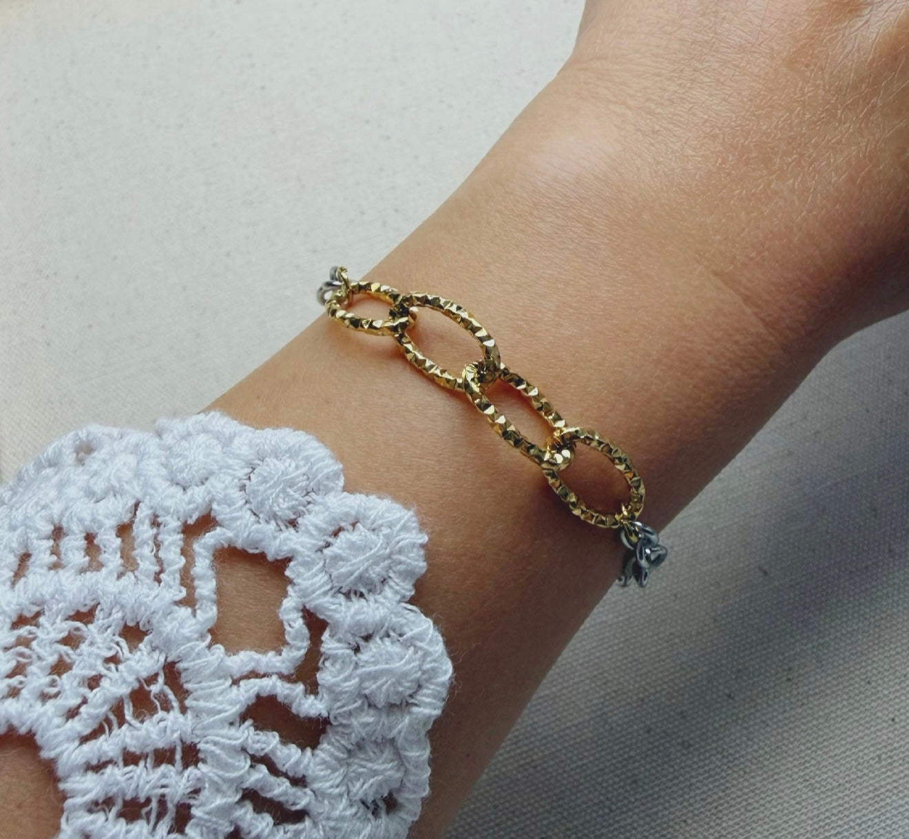 Dieses stilvolle Armband vereint modernes Design mit zeitloser Eleganz. Die markanten, ovalen Glieder wechseln harmonisch zwischen goldfarbenem und silberfarbenem Edelstahl und verleihen dem Schmuckstück einen edlen Bicolor-Look. Die fein strukturierte Oberfläche sorgt für einen dezenten Glanz und macht das Armband zu einem echten Blickfang am Handgelenk.