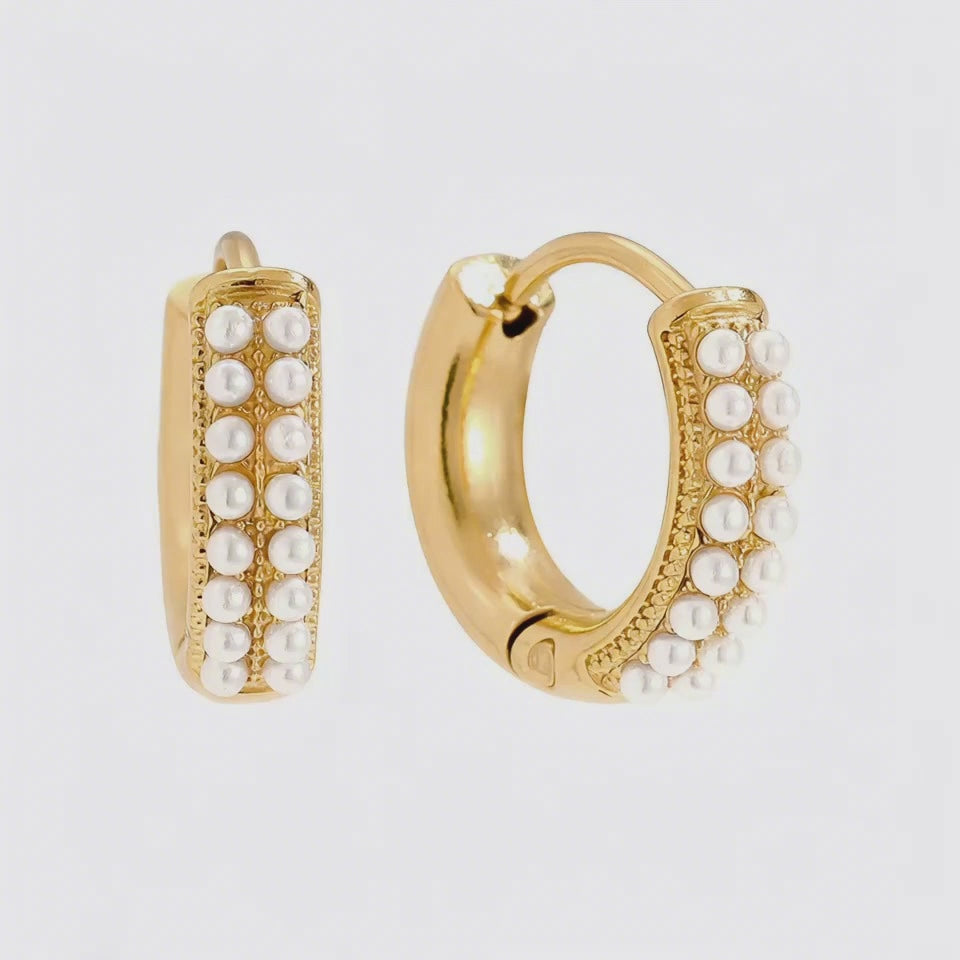 Diese eleganten Kreolen sind mit zahlreichen kleinen, weißen Kunstperlen verziert und verleihen jedem Outfit eine stilvolle, feminine Note. Die feine Anordnung der Perlen sorgt für einen zarten Glanz und lässt die Ohrringe zugleich klassisch und modern wirken.