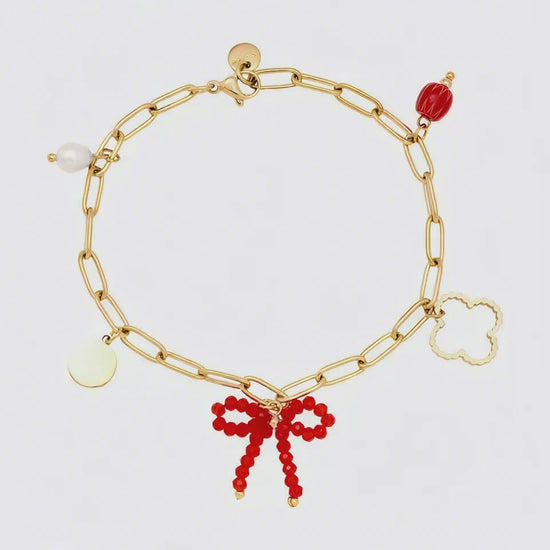 Setze einen charmanten Akzent mit unserem eleganten Charme-Armband in Goldfarbe, verziert mit einer liebevollen roten Schleife. Dieses besondere Detail verleiht dem Armband einen verspielten, romantischen Touch und macht es zu einem perfekten Accessoire für besondere Anlässe oder als süßes Geschenk für einen Herzensmenschen.