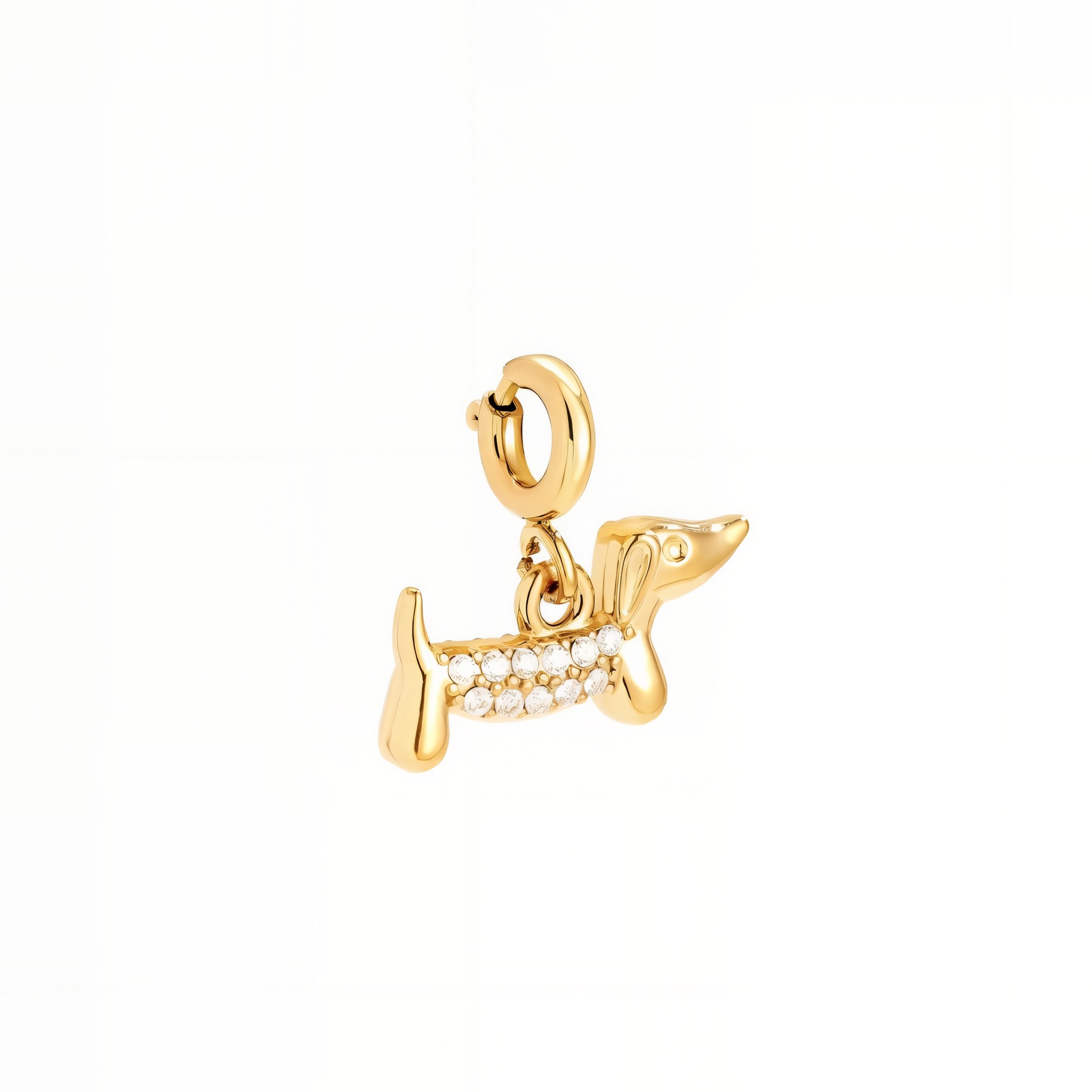 Der Dackel-Charm ist ein liebevoll gestalteter Schmuckanhänger, der Tierliebe und Eleganz harmonisch vereint. Gefertigt aus hochwertigem goldfarbenem Edelstahl, überzeugt er durch seine langlebige Qualität und seinen edlen Glanz. Die funkelnden Zirkonia-Steine setzen stilvolle Akzente und verleihen dem Dackel-Motiv eine besondere Ausstrahlung. Der Charm kann flexibel an Armbändern oder Halsketten getragen werden und lässt sich jederzeit abnehmen und austauschen – ideal für individuelle Looks und wechselnde Kombinationen.