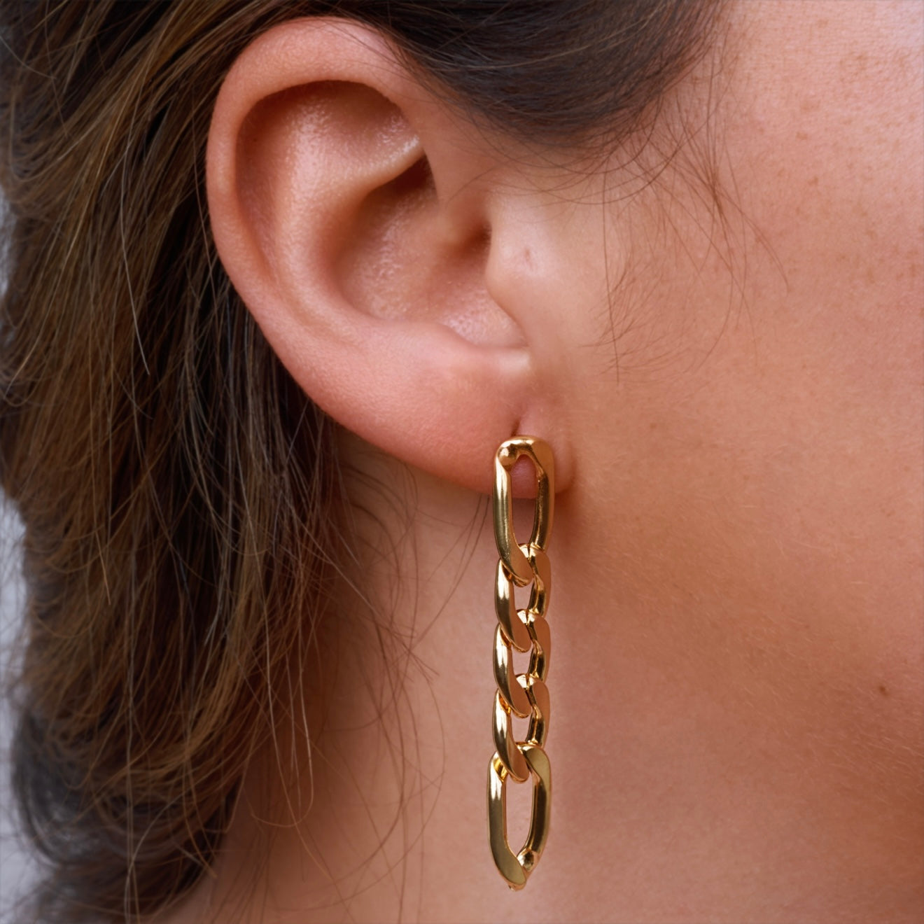 Diese stilvollen Ketten-Ohrringe überzeugen durch ihr klares, modernes Design. Die längliche Gliederkette in goldfarbenem Edelstahl fällt elegant am Ohr entlang und verleiht jedem Look eine zeitlose Coolness. Die polierte Oberfläche sorgt für einen edlen Glanz, während das reduzierte Design die Ohrringe vielseitig kombinierbar macht – perfekt für Alltag, Business oder Abendlooks. Ein Must-have für alle, die Minimalismus mit Statement-Charakter lieben.