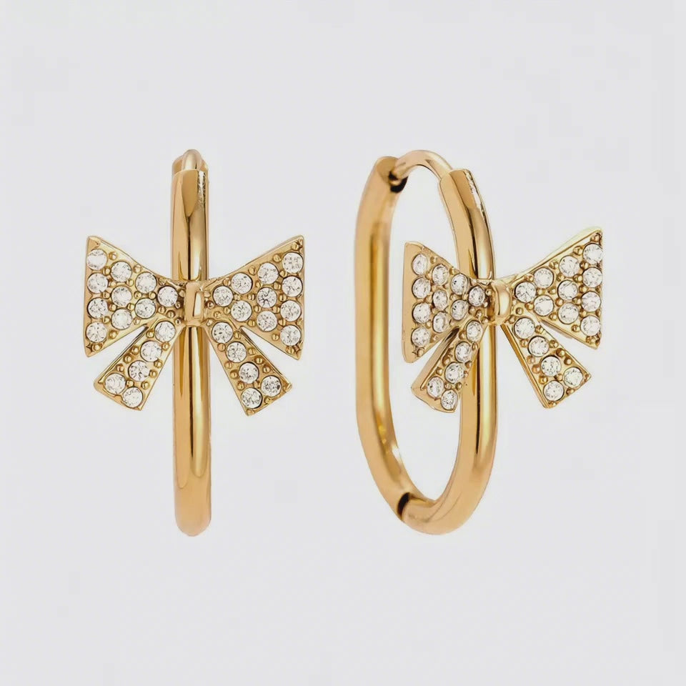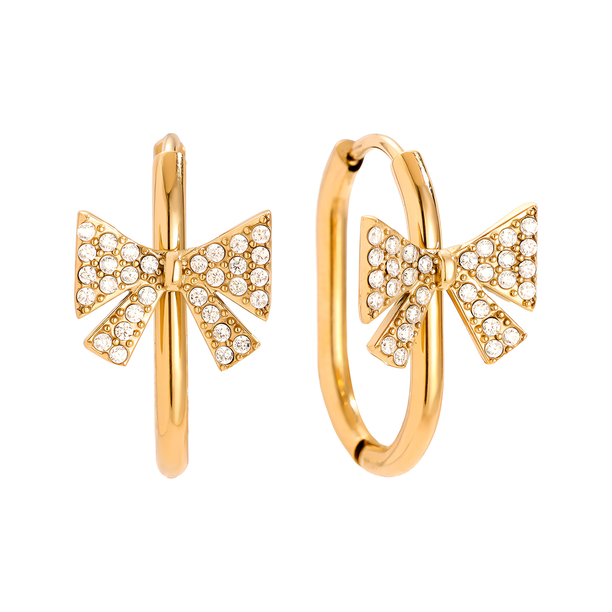 Verleihe deinem Look eine feminine und elegante Note mit diesen zauberhaften Schleifen-Ohrringen. Die Ohrringe bestehen aus hochwertigem, vergoldetem Edelstahl und sind mit funkelnden Zirkonia-Steinen verziert, die dem Schmuckstück einen edlen Glanz verleihen. Die filigrane Schleifenform sorgt für einen verspielten, zugleich stilvollen Akzent.