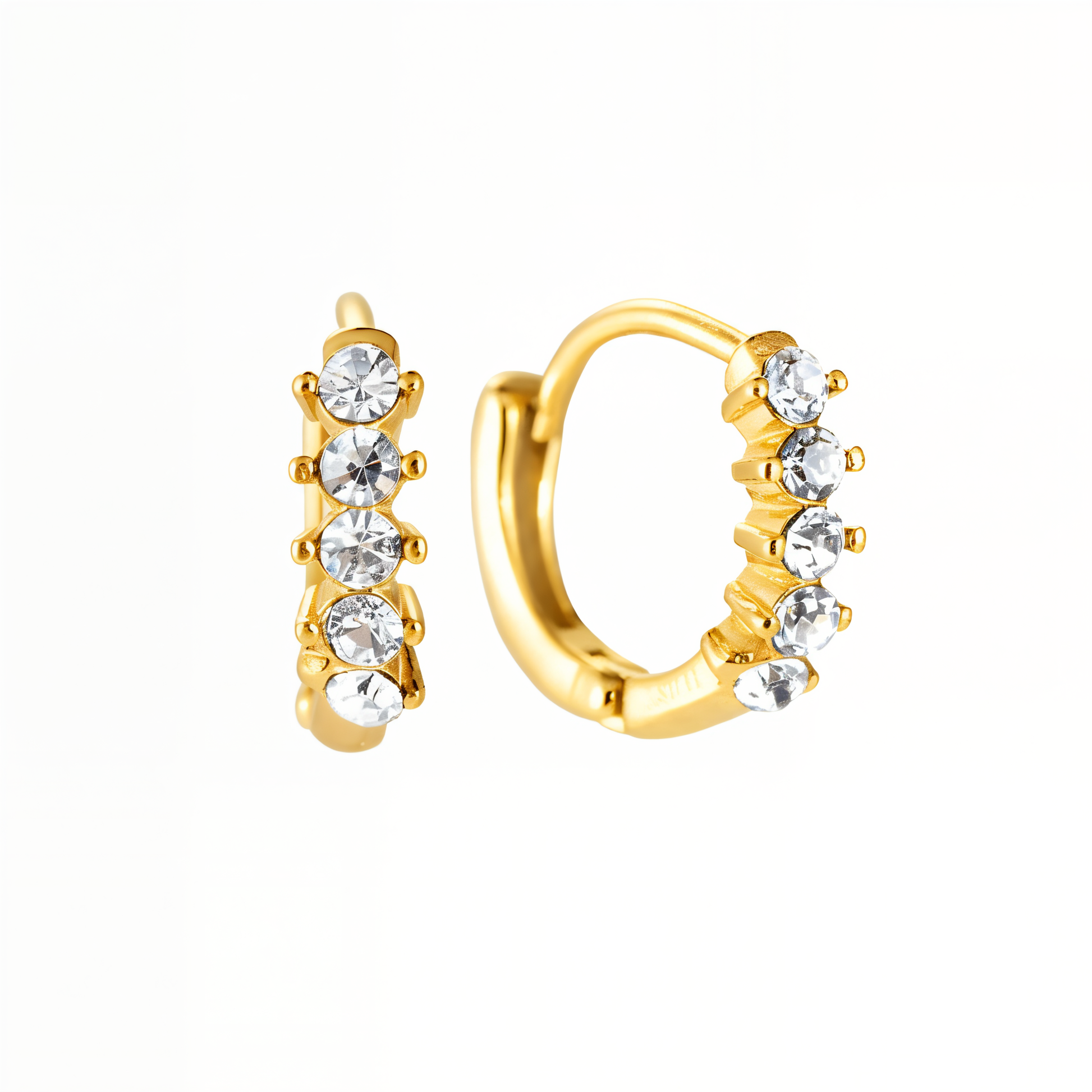 Diese wunderschönen goldenen Creolen aus Edelstahl vereinen klassische Eleganz mit einem Hauch von Glamour. Die feine, runde Form wird durch fünf funkelnde Zirkonia-Steine veredelt, die das Licht bei jeder Bewegung einfangen und für ein strahlendes Funkeln sorgen.