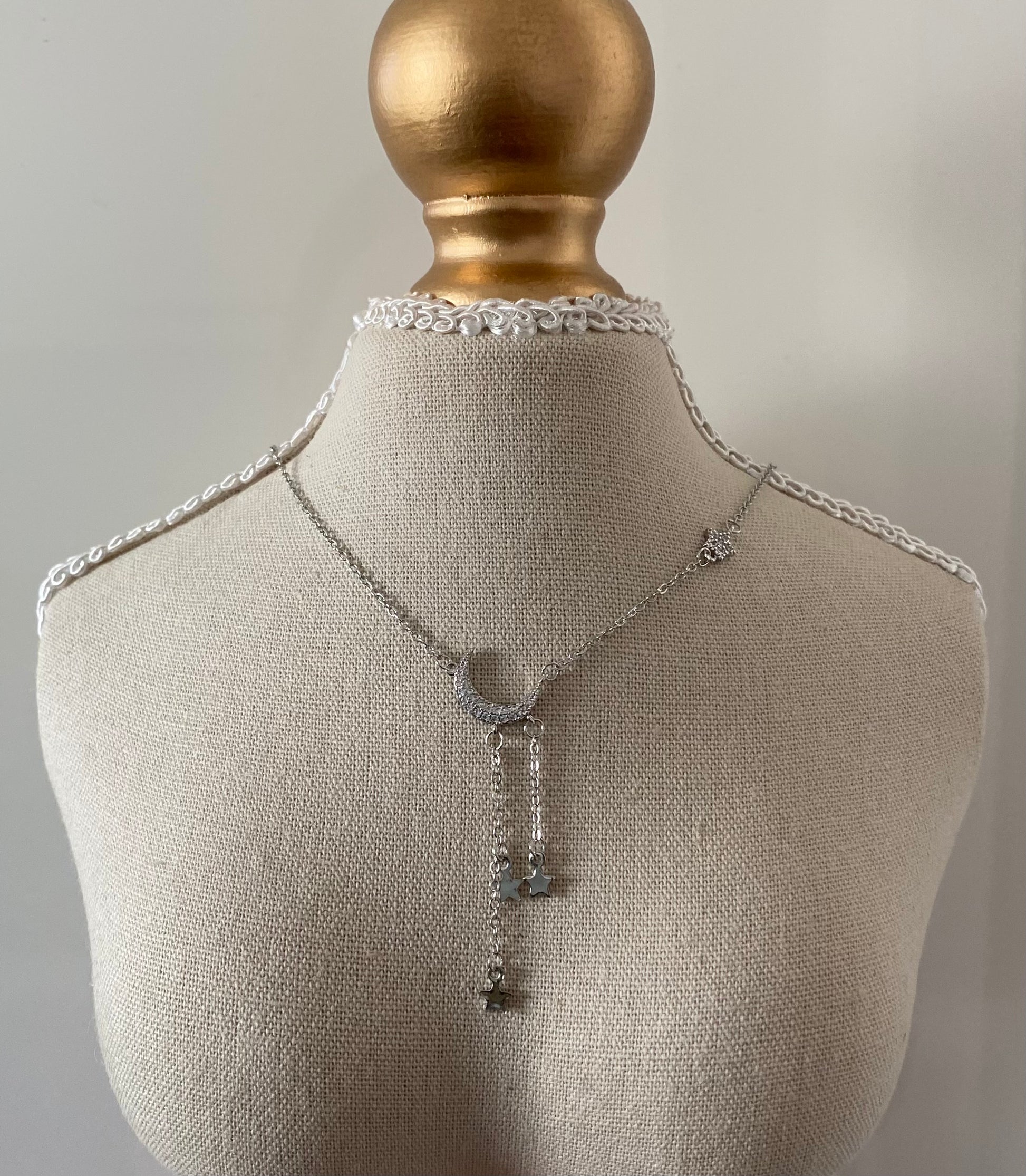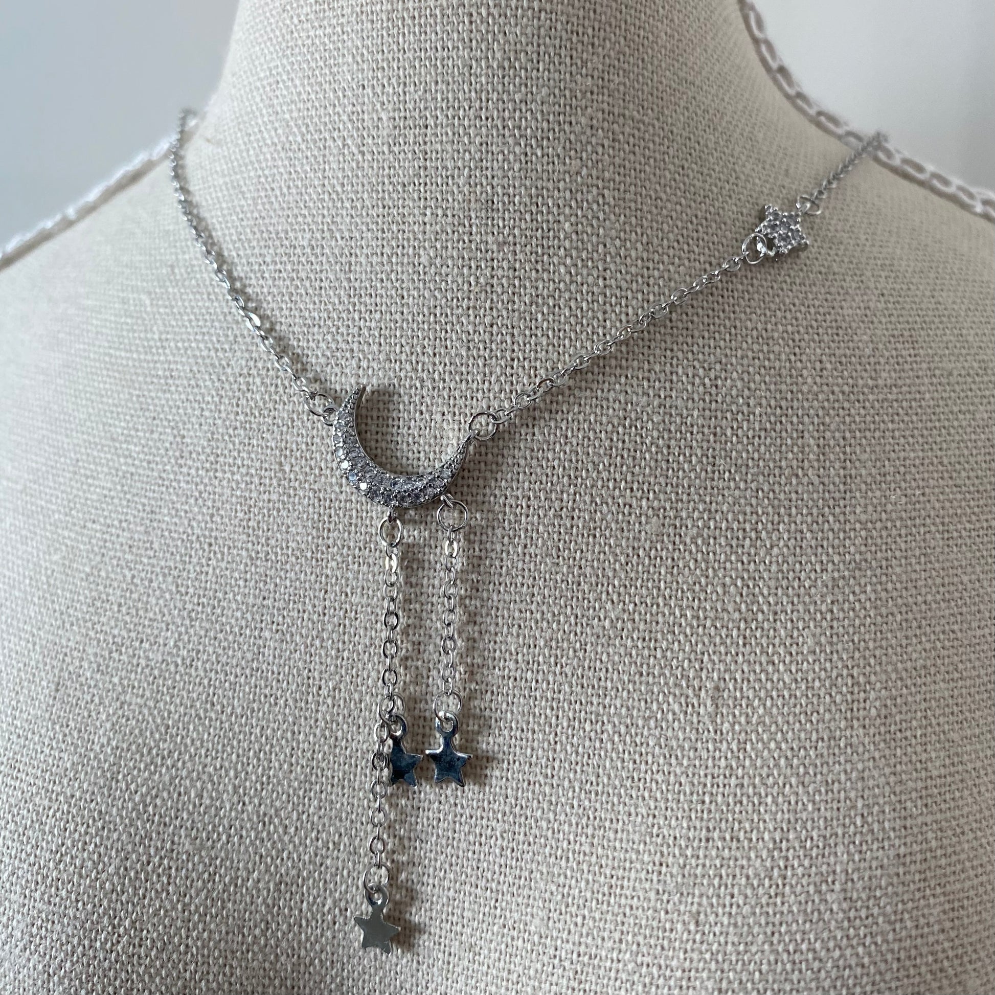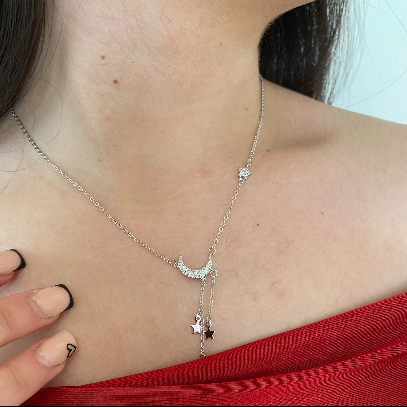 Verleihe deinem Look eine himmlische Note mit dieser eleganten Halskette aus hochwertigem 925er Sterlingsilber. Im Mittelpunkt steht ein funkelnder Mond, geschmückt mit weißen Zirkoniasteinen und drei zart fallenden Sternen – ein echter Blickfang. Dieses edle Schmuckstück verleiht deinem Stil einen glanzvollen, romantischen Akzent.